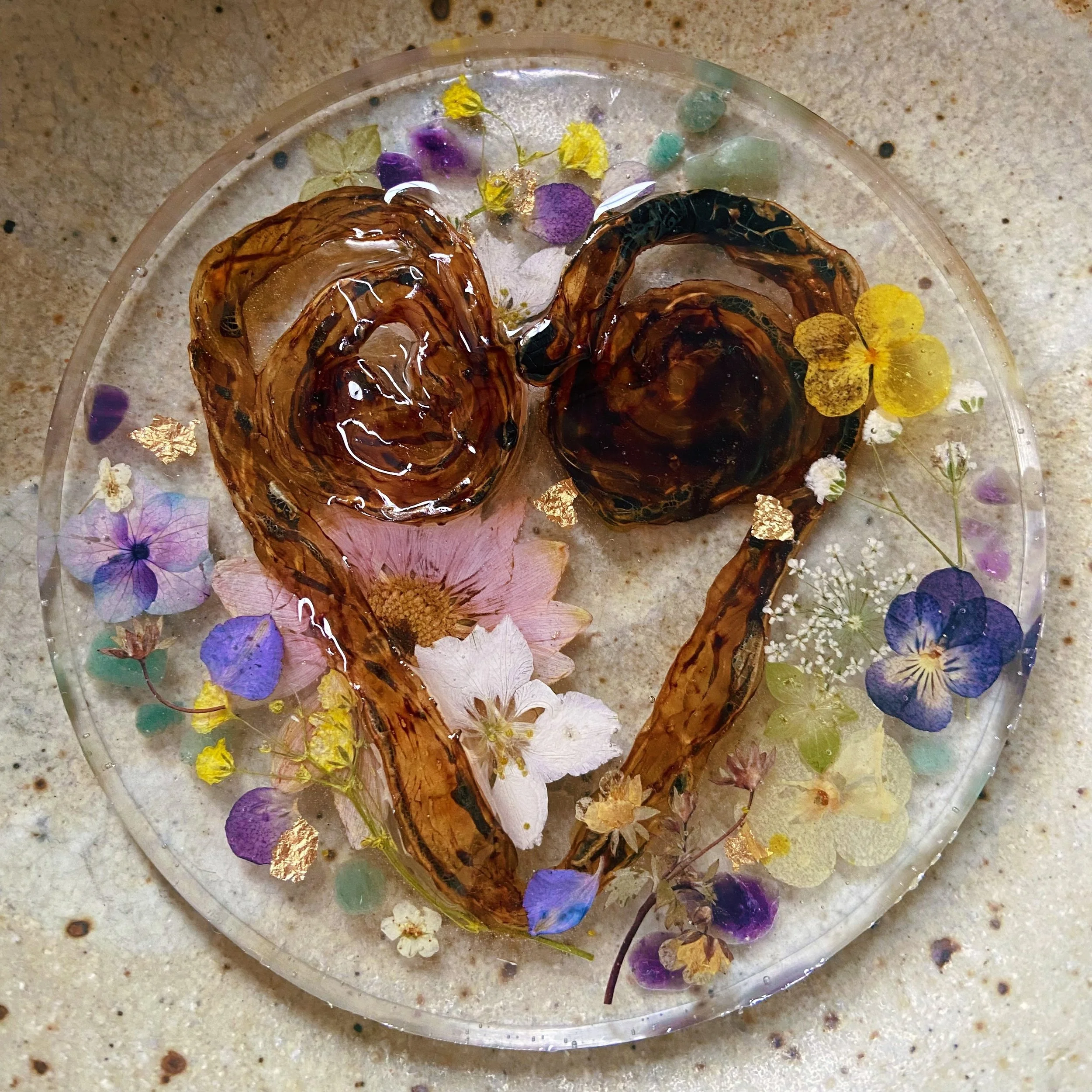 Your baby’s umbilical cord will be cast in clear resin, woven amongst dried flowers, crystals and gold leaf, to create a beautiful and unique piece of art from the cord that connected you and your baby in the womb.